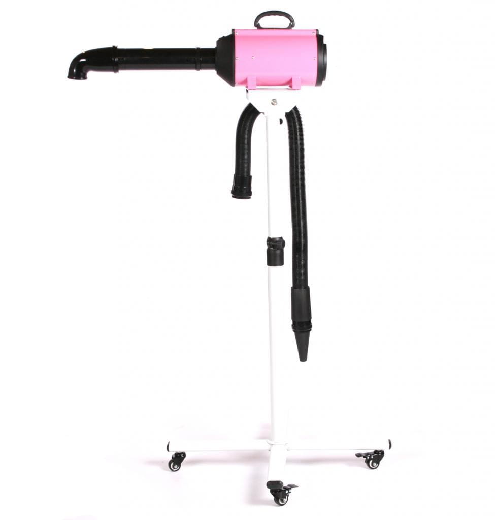 Das Set enthält einen höhenverstellbaren Trockenständer auf Rädern, einen flexiblen Schlauch und drei Aufsätze.