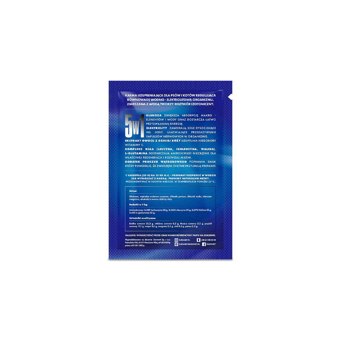 Ergänzungsfuttermittel für Hunde und Katzen zur Regulierung des Wasser-Elektrolyt-Gleichgewichts im Körper. Mit Wasser gemischt bildet es eine isotonische Lösung.